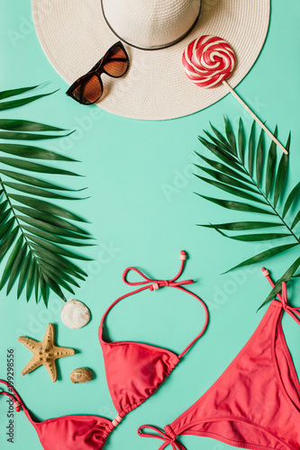 Red Pink Bikini Suit Lollipop Sunglasses Plam Leaves On Plain